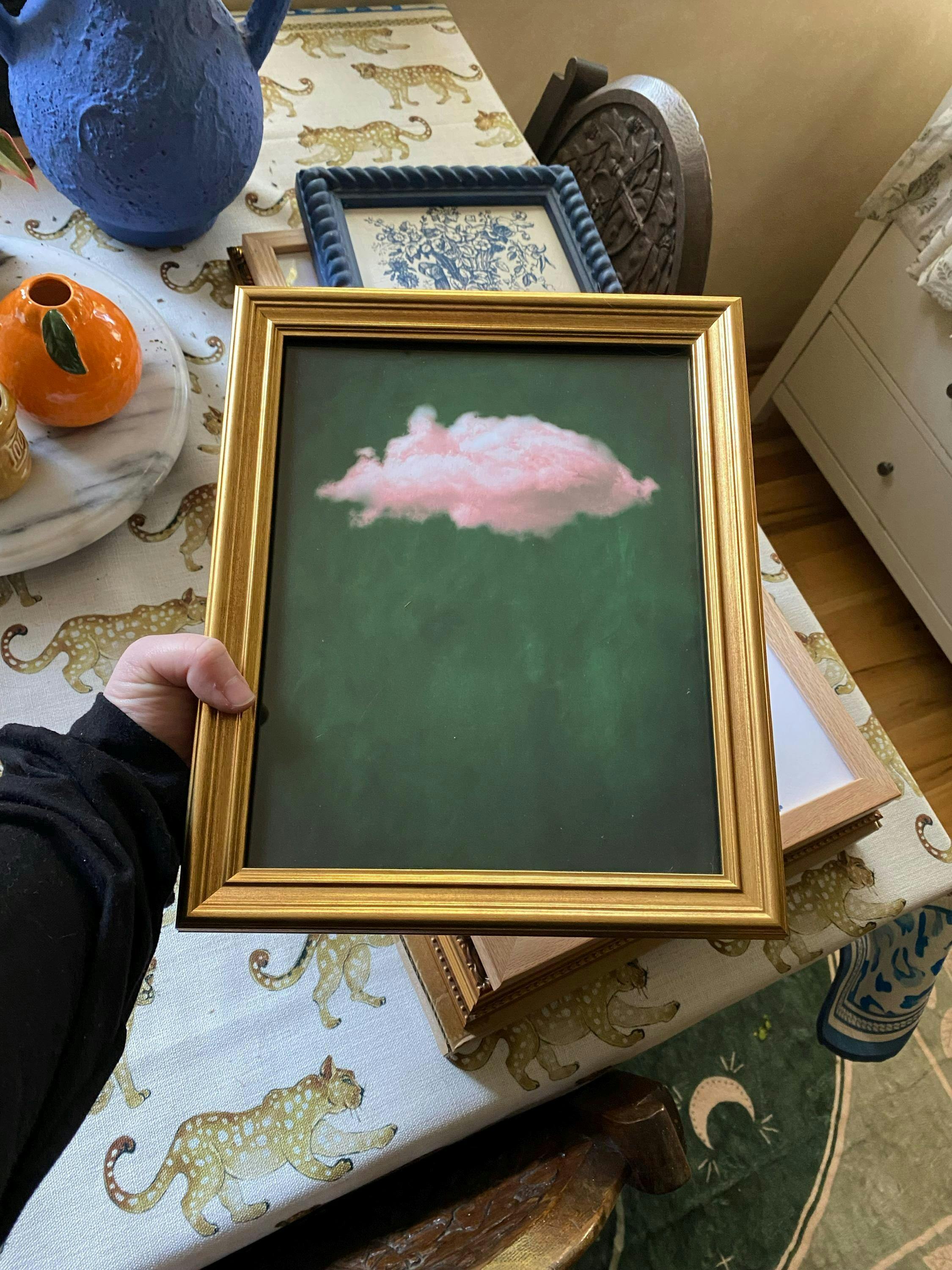Nuage is a wonderfully unique piece featuring a pink cloud illustration set against an emerald green textured background, the perfect wall art for your minimalist or maximalist interior!