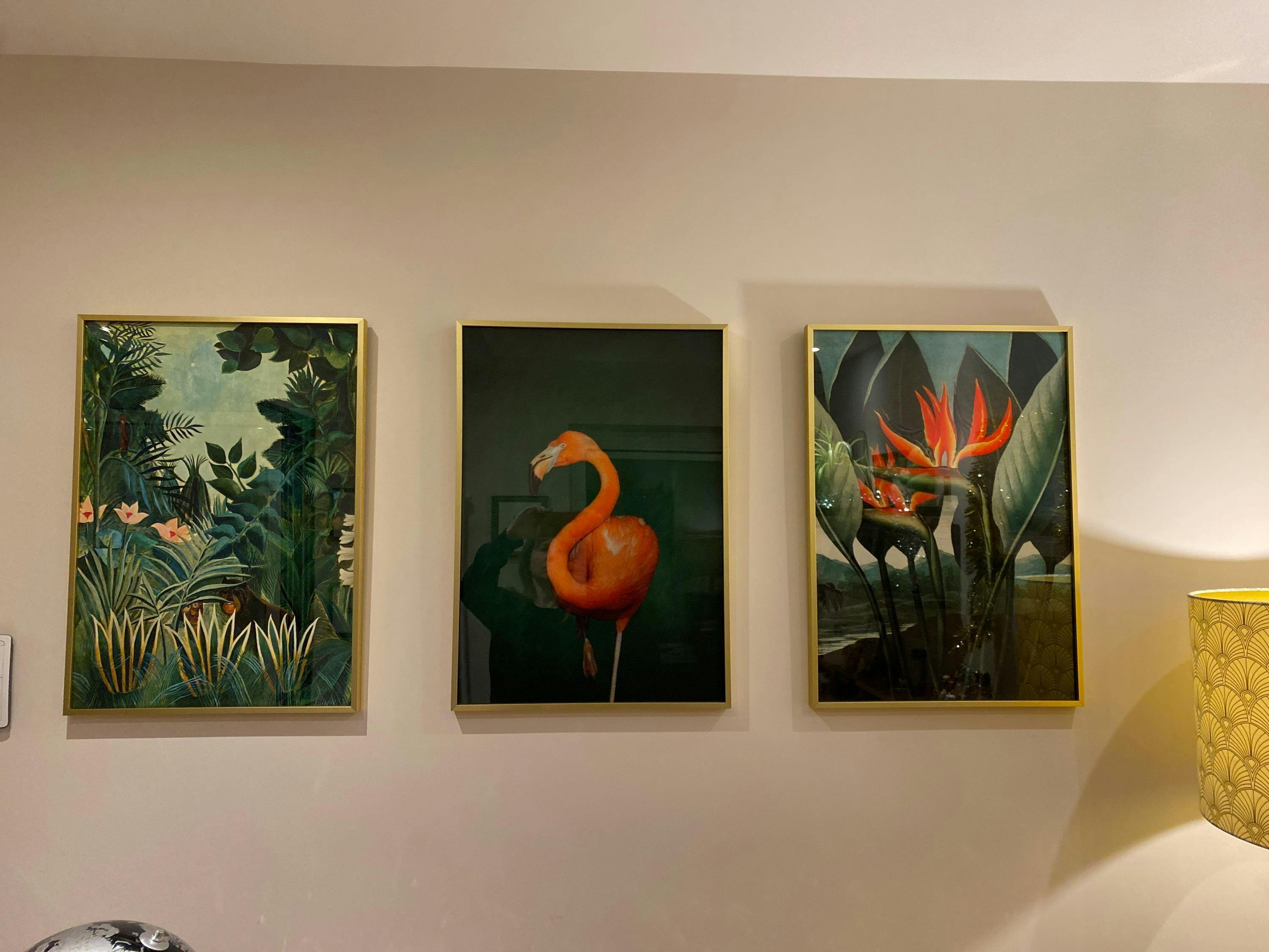 This gallery wall set showcases three of our best selling prints. A tropical flamingo print sits alongside Henri Rousseau's the Equatorial Jungle and John Thornton's Bird of Paradise artworks - this modern wall art set is an Aureous original and cannot be found anywhere else!