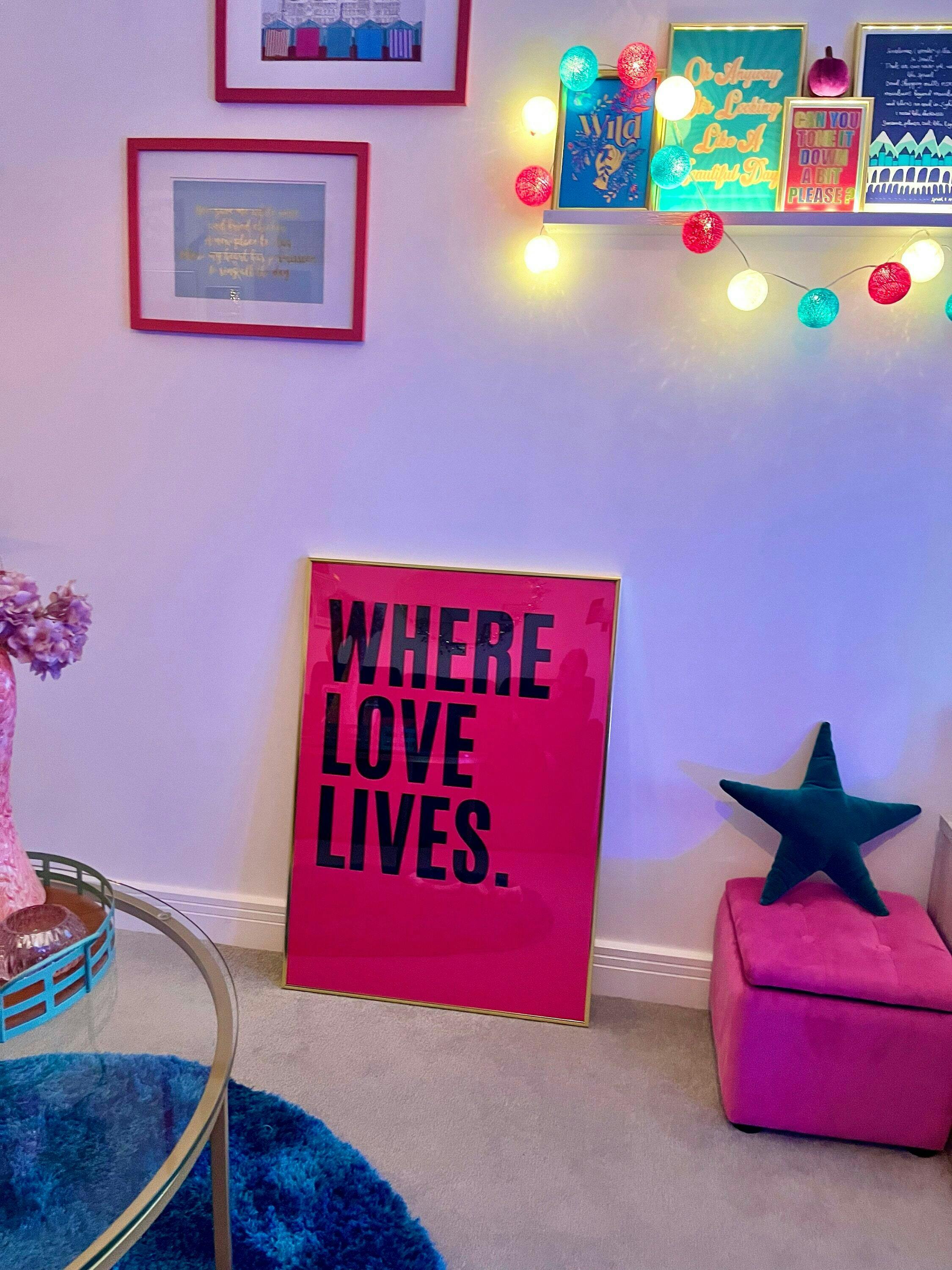 Go one step further and set your living space on fire with this fearless hot pink Where Love Lives print.