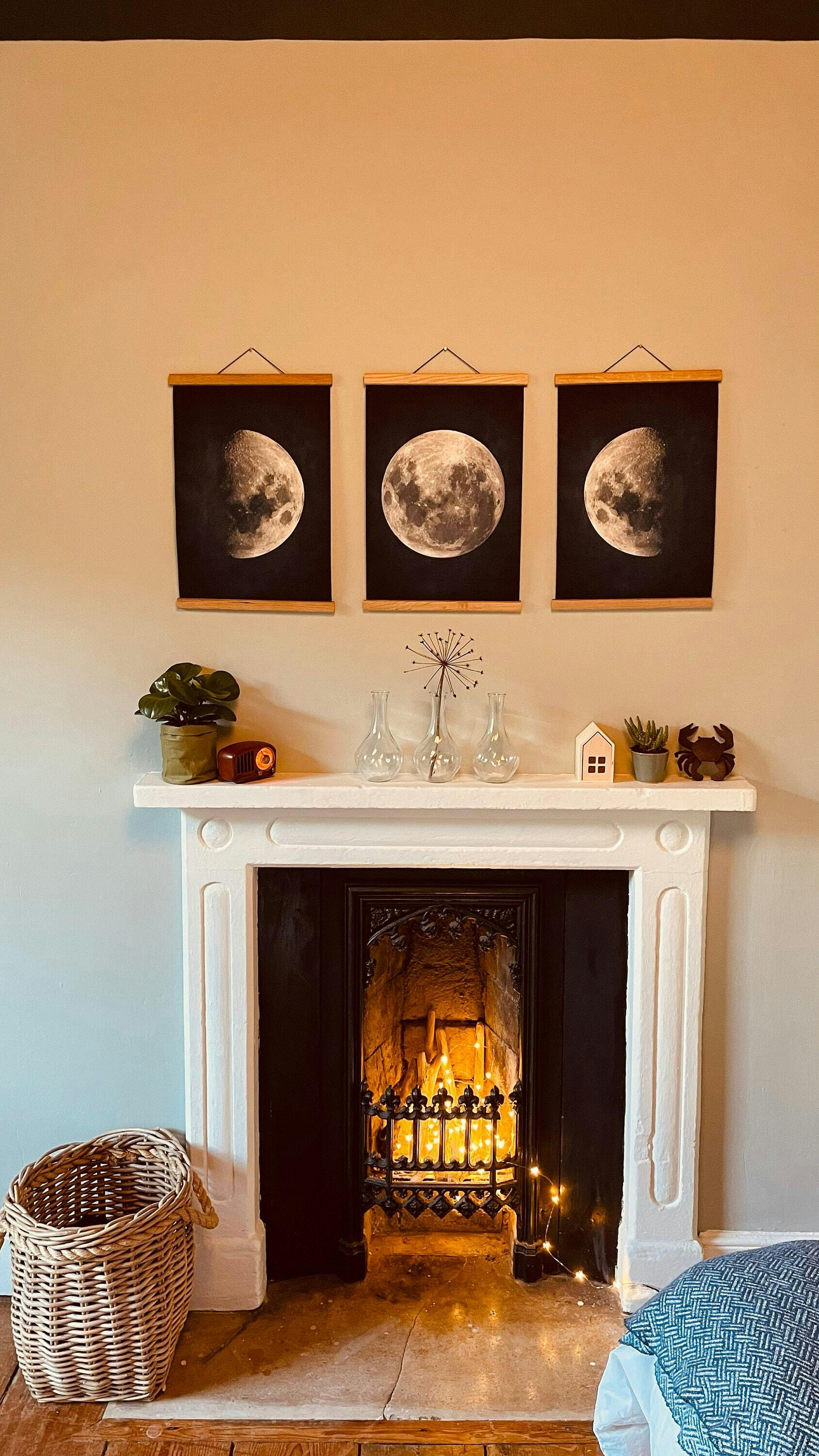 This gallery set features three distinct phases of the moon, with two delicate half-moons gracefully encircling a full moon, creating a captivating representation of celestial transformation.