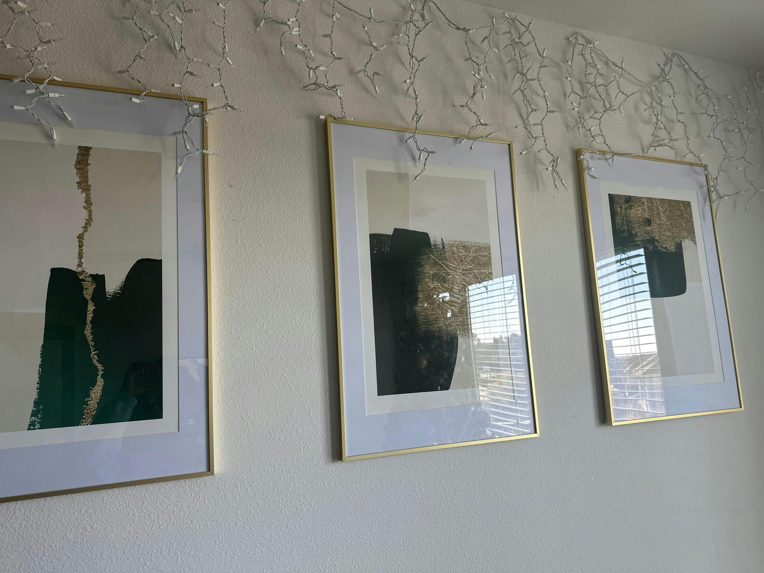 Exclusively available from Aureous. Vibrant textured emerald green abstract shapes are set against distressed gold elements for a wonderfully unique wall decor piece that are a firm customer favourite. Try hanging this gallery wall set in your living room for a stunning and totally luxe focal point.
