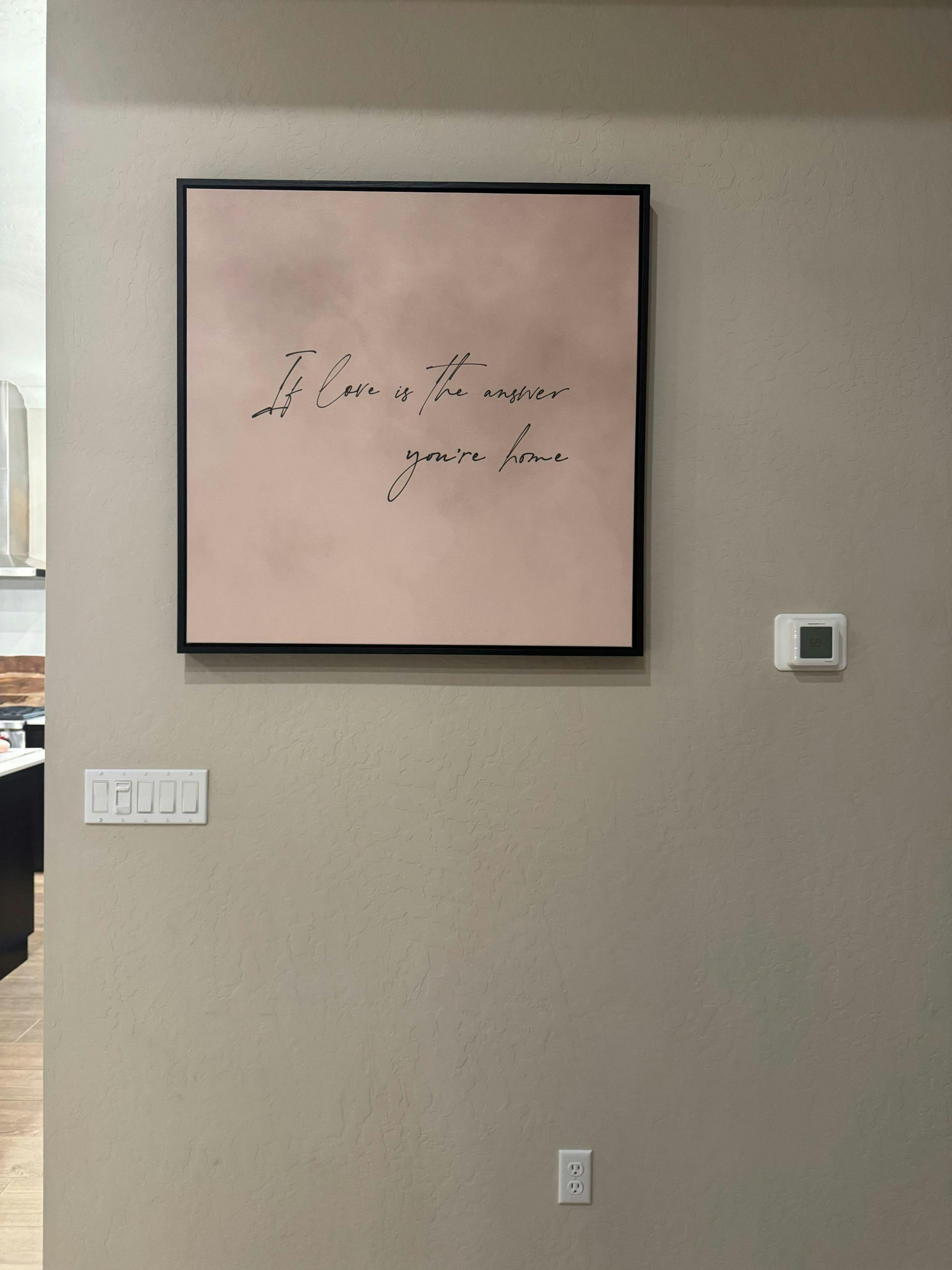 Aureous's "If love is the answer, you're home," bestselling canvas is beautifully rendered in delicate script, evoking a sense of contentment. The soft beige background and sleek wooden floating frame add a touch of timeless elegance, making it a perfect fit for any interior style. This original artwork is perfect for a home filled with love.