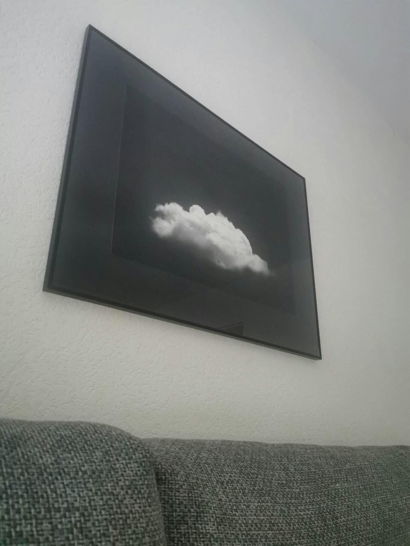 Just like its horizontal predecessor, this wall art features a white cloud illustration set against a textured background. This time, we've added a moody element to our fluffy friend, who this time sits at the bottom of the art.