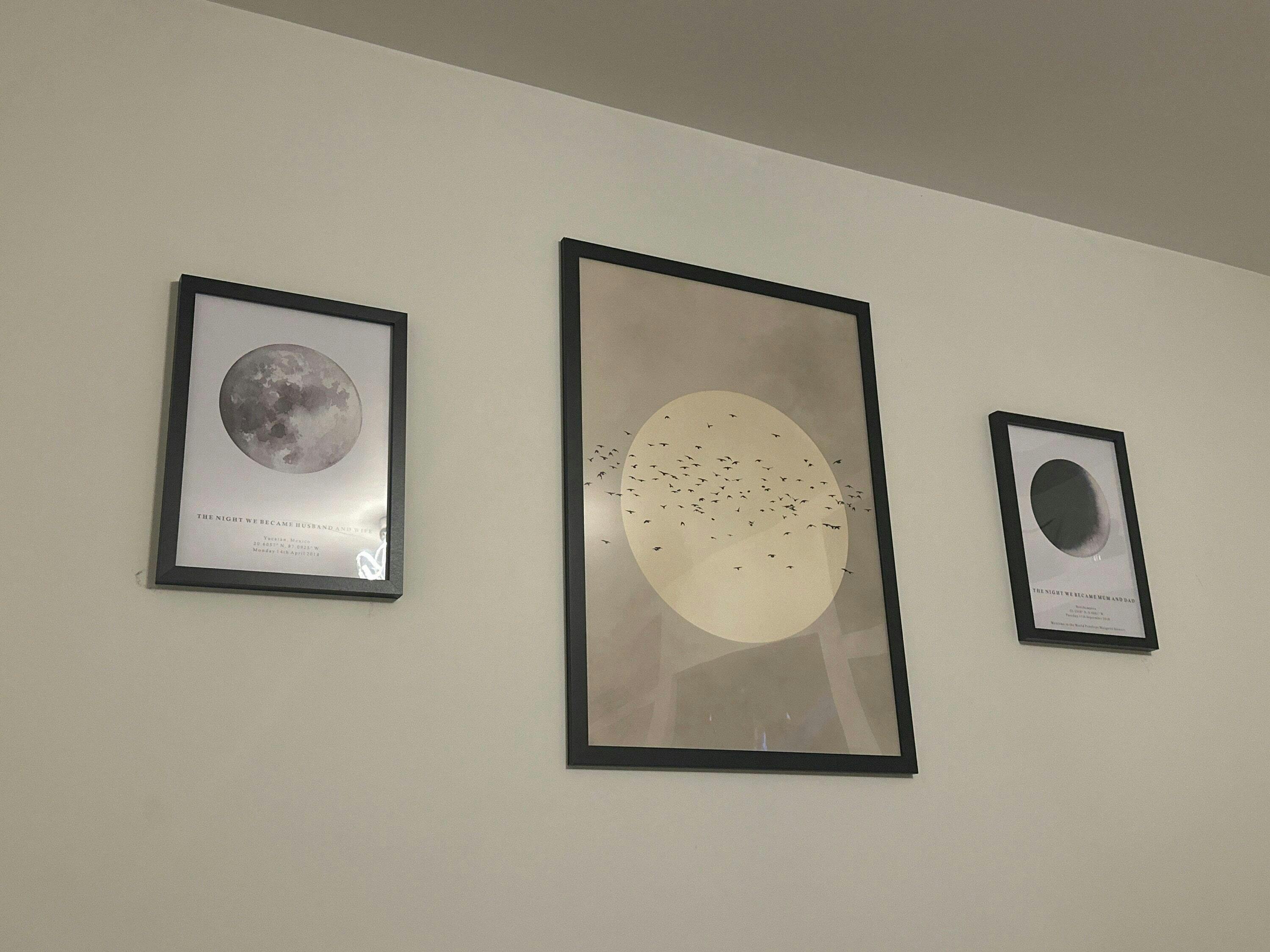 The perfect addition for any minimalist living space is this wall art featuring a faraway flock of birds encircling a cool moon against a calming neutral backdrop.