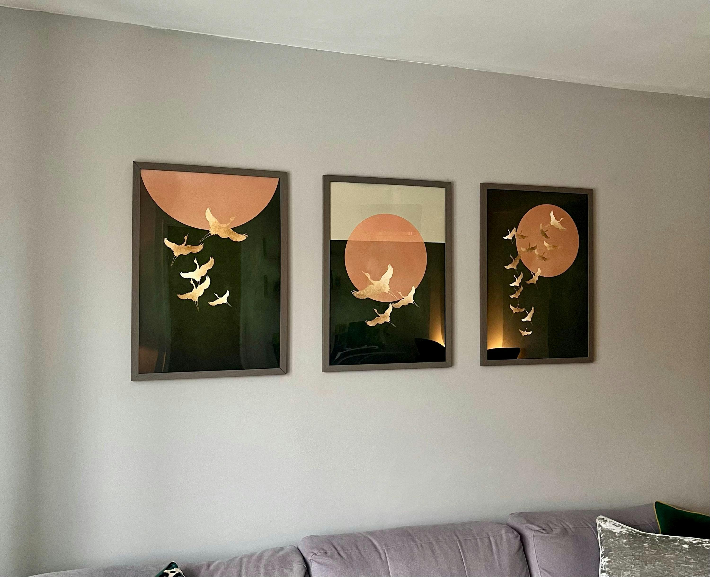 Aureous's Tsuru wall art prints are Inspired by the serene beauty of traditional Japanese art. These oh-so-pretty prints depict graceful cranes elegantly contrasting against a vibrant forest green background, accented with intricate golden details. Each print captures the timeless essence of Japan's rich culture, as the majestic cranes symbolize longevity and good fortune, while the radiant sun signifies warmth and vitality.