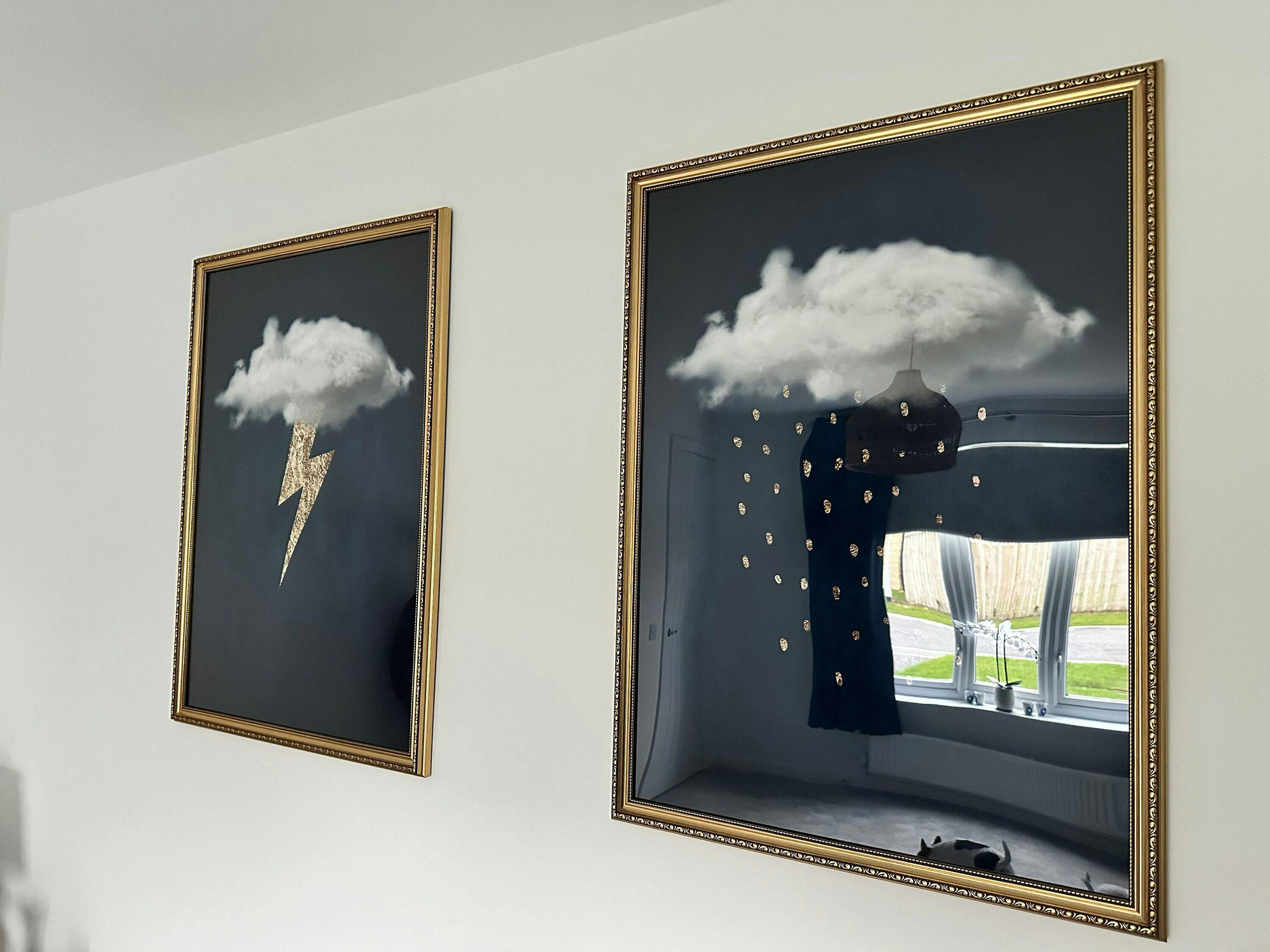 The perfect pair! Zeus is a luxe take on our bestselling Nuage art print. It features a gold lightning bolt and golden raindrops emanating from two solitary clouds. The bold and vibrant sapphire blue textured background draws you in and adds a sophisticated touch to this modern wall art set. Tip: hang them in your living room in gold frames to give your interior the Midas touch!